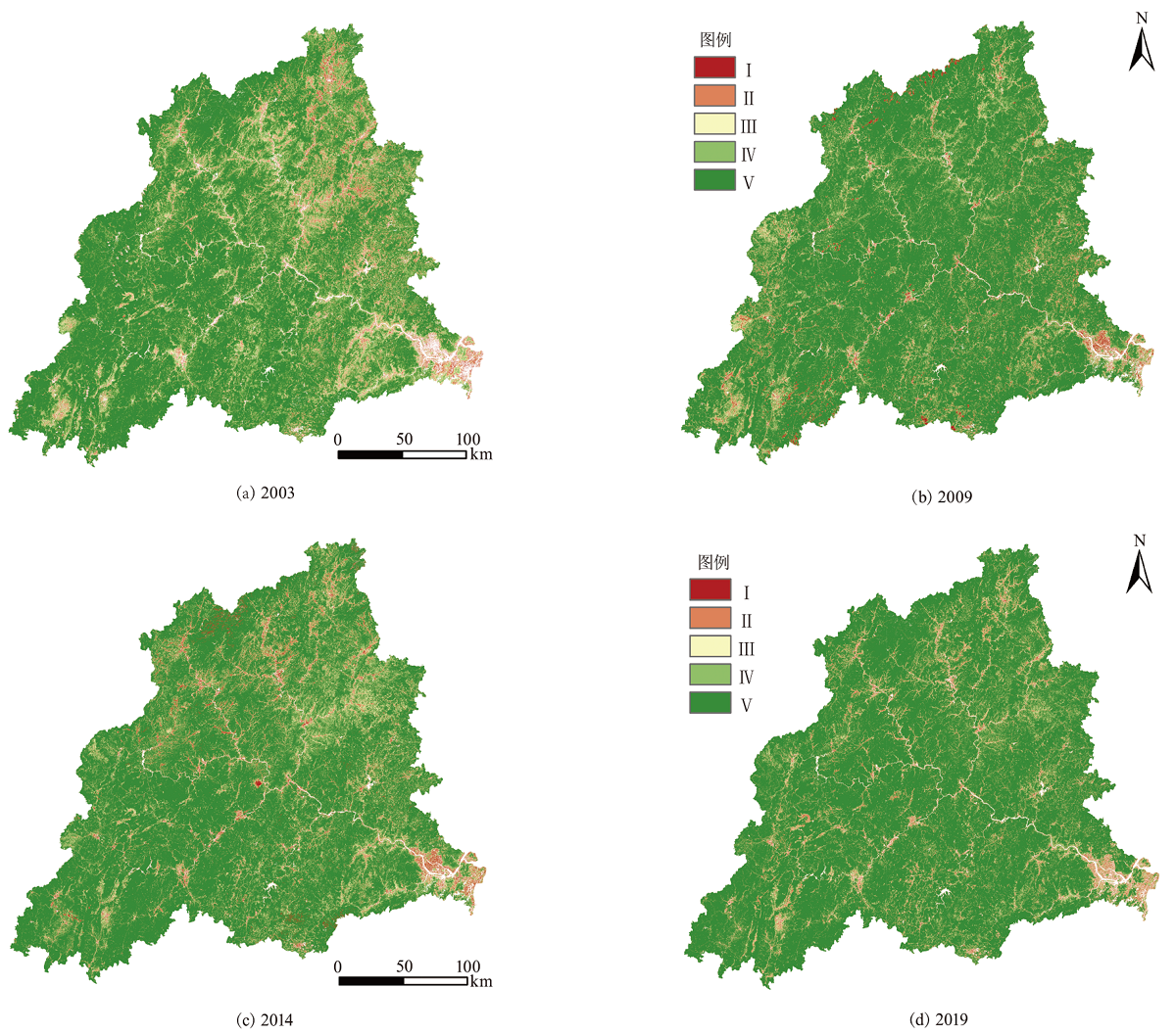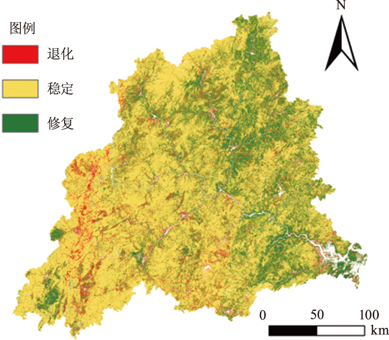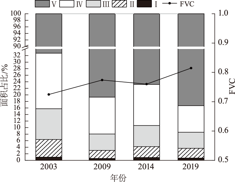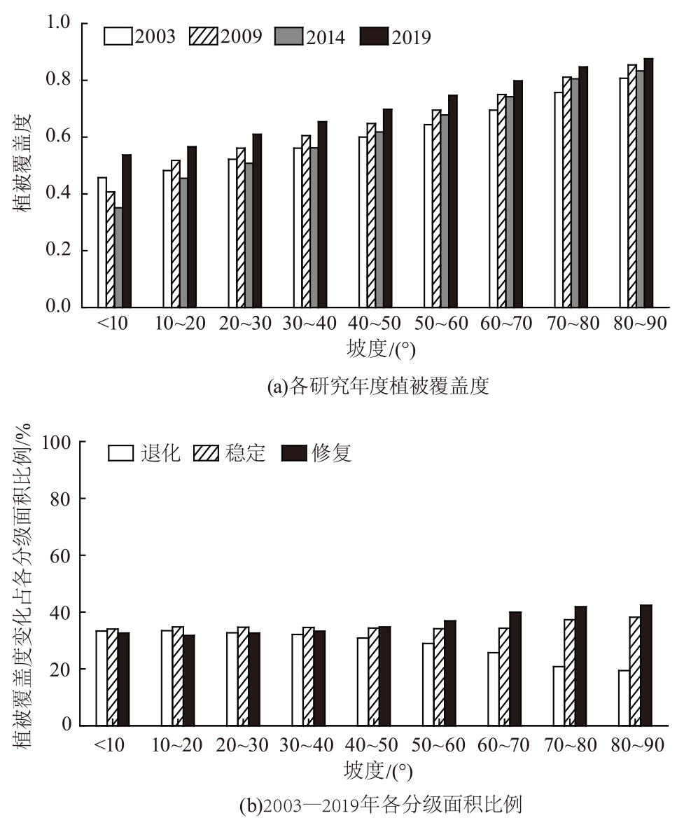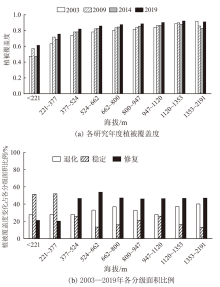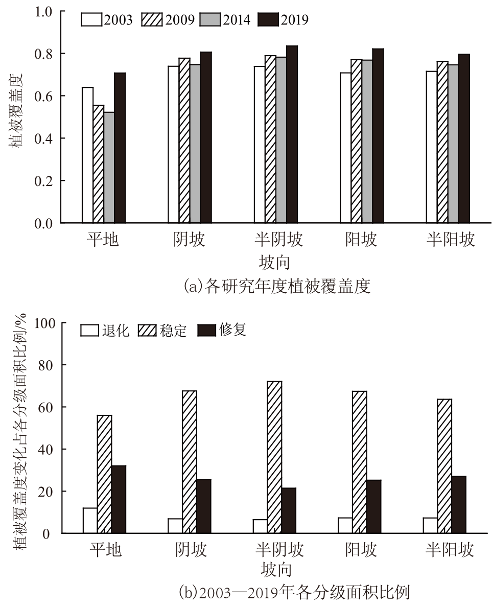 In order to reveal the influence of the complexity of the regional topography on the vegetation coverage and to provide the basis for formulating reasonable economic and environment protection strategies in the basin area,this paper used the mixed pixel decomposition method to estimate the vegetation coverage,and analyzed the temporal and spatial characteristics of vegetation coverage and the topographic differentiation characteristics of vegetation change based on the Landsat TM and Landsat OLI images of the Minjiang River Basin in Fujian Province in 2003,2009,2014 and 2019 respectively. The results showed that:1)TheFractional Vegetation Cover (FVC) in the Minjiang River Basin increased from 0.72 in 2003 to 0.81 in 2019 and the FVC in the mountainous area was better than that along lakes and rivers. 2)The basin as a whole was developing in the direction of restoration.,and the vegetation coverage grades I,II,III,and IV transformed to grade V. Except for the expansion of grade V,the area of all grades had contracted,and the contraction area was IV (0.43)> III(0.39)> II(0.36)>I(0.17).3) The vegetation coverage of flat land was the smallest.With the elevation and slope increasing,the vegetation coverage of the Minjiang River Basin increased. In the range of elevation < 377 m and slope < 30 °,the degraded area was larger than the repaired area. The stability of vegetation coverage on flat land is the lowest. The analysis showed that the vegetation coverage of Minjiang River Basinwas affected by topographic factors. When formulating vegetation restoration policies,topographic factors should be fully considered.