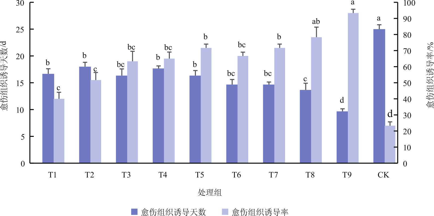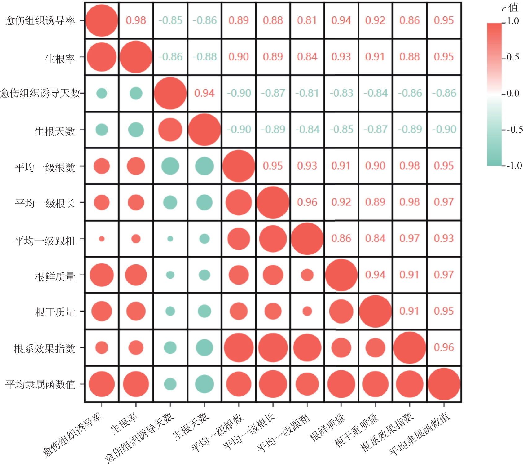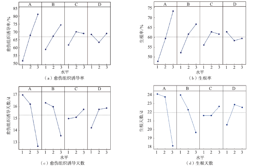 多花勾儿茶是我国集蜜源、观赏和药用等功能为一体的传统珍贵树种,具有较好的生态和经济效益。为优选其高空压条繁殖的最佳条件,提高和完善其无性快繁技术,采用四因素三水平L9(34)正交试验设计,探究不同基质配比、外源激素种类、外源激素浓度以及环剥宽度对多花勾儿茶高空压条生根的影响,并运用模糊数学隶属函数法和相关性分析法对各项生根指标进行综合评价,探讨4种因素对压条生根的作用机制。结果显示,适宜的基质和外源激素配比可显著促进多花勾儿茶形成愈伤组织并生根,同时可使各项根部指标增加。方差分析和极差分析表明,生根效果存在基质、外源激素和环剥的差异,其中基质配比和外源激素种类是影响各生根指标的最主要因素。综合评价得出,最有利于多花勾儿茶压条生根的条件为:珍珠岩+草炭+蛭石(1∶1∶1)作为基质、NAA作为生长调节剂、NAA浓度为400 mg/L,环剥宽度为10 mm,该条件下愈伤组织诱导率高达(93.33±2.36)%,生根率高达(85.00±4.08)%,(9.67±0.47)d即可在伤口处形成愈伤组织,(14.00±0.82)d开始生根,平均一级根数[(15.44±0.51)根]、平均一级根长[(7.13±0.25)cm]、平均一级根粗[(3.03±0.21)mm]、根鲜质量[(3.29±0.05)g]、根干质量[(0.67±0.04)g]、根系效果指数(5.50±0.06)、平均隶属函数值(0.77)均为最高。该研究可为建立多花勾儿茶快繁体系,推广多花勾儿茶栽培提供理论参考和数据支撑。