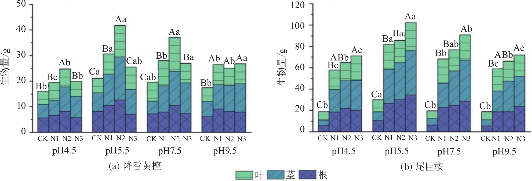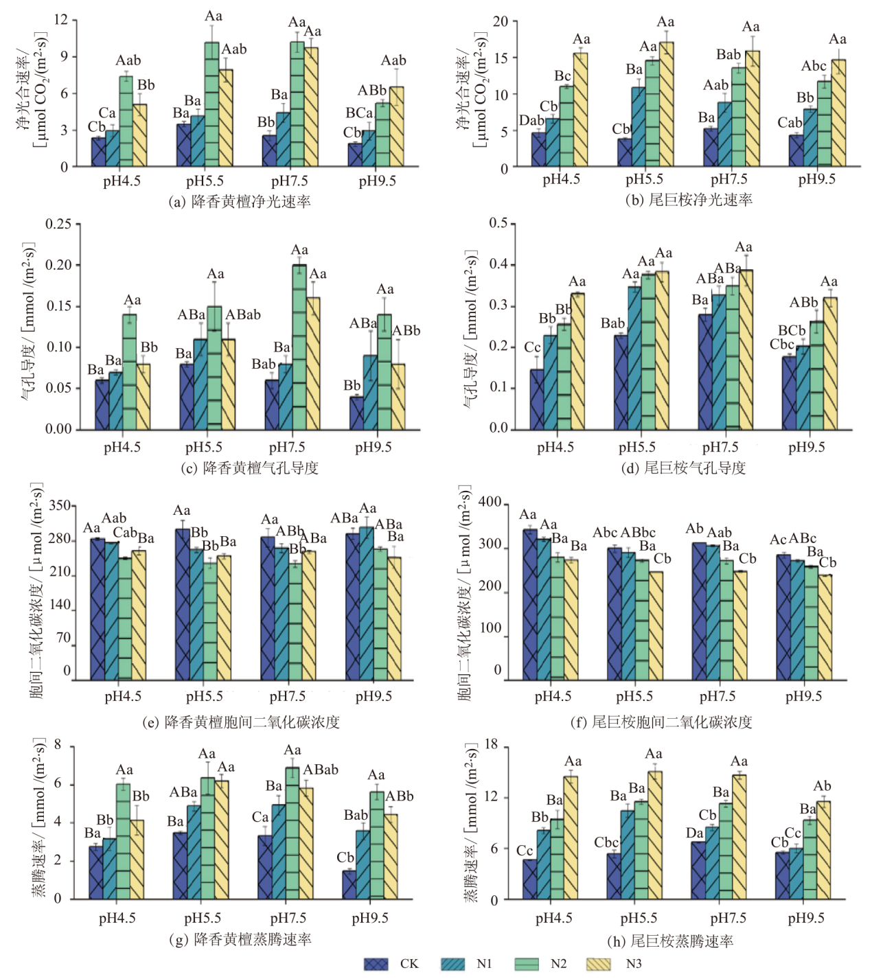 | pH5.5 | 降香黄檀 D.odorifera | CK | 309.01±27.12Ba | 403.81±42.81Ba | 10.52±1.13Aa | 1.91±0.22Aa |