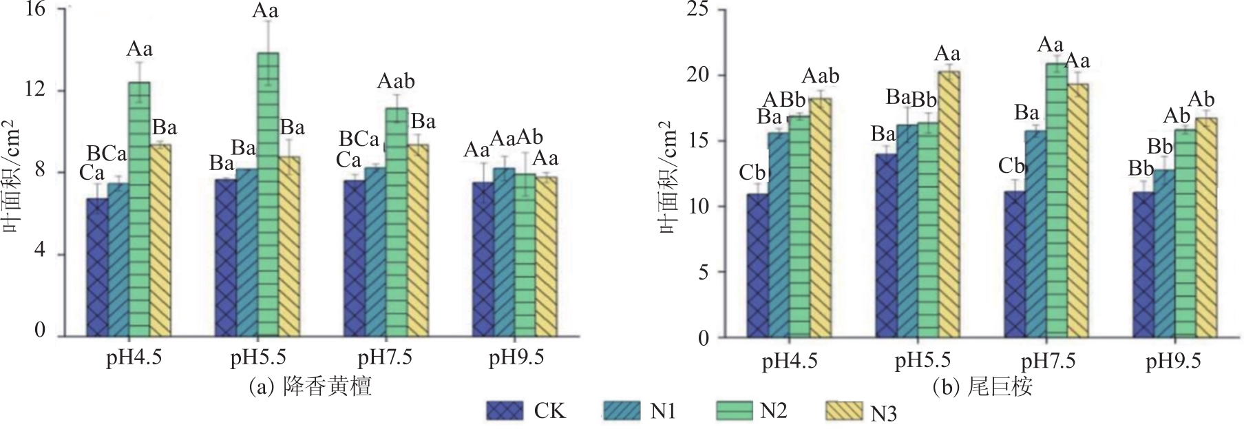 | pH4.5 | 降香黄檀 D.odorifera | CK | 154.28±18.33Cc | 214.81±42.81Bb | 5.02±0.14Bb | 0.95±0.12Cb |