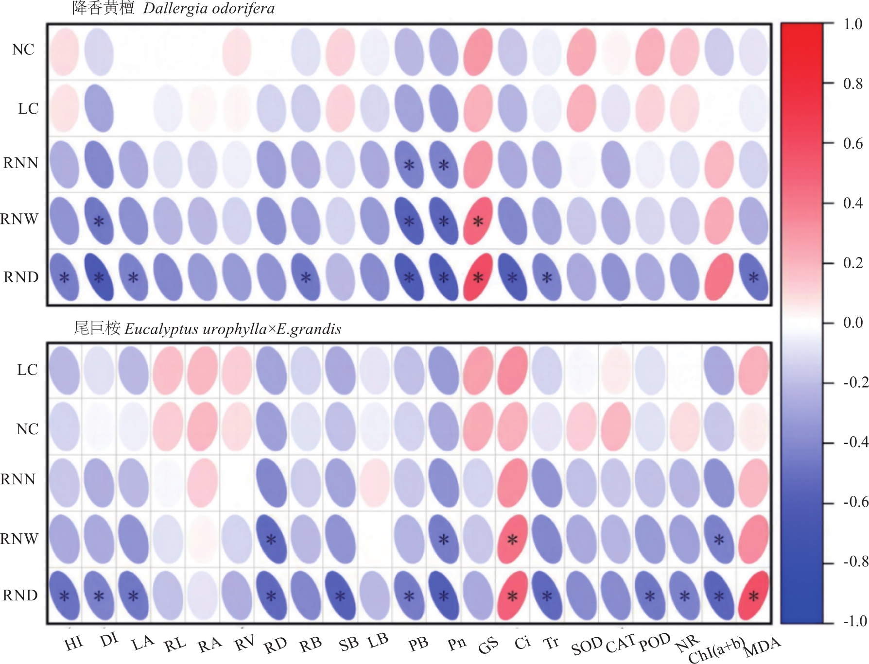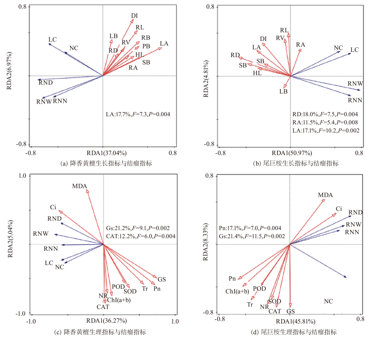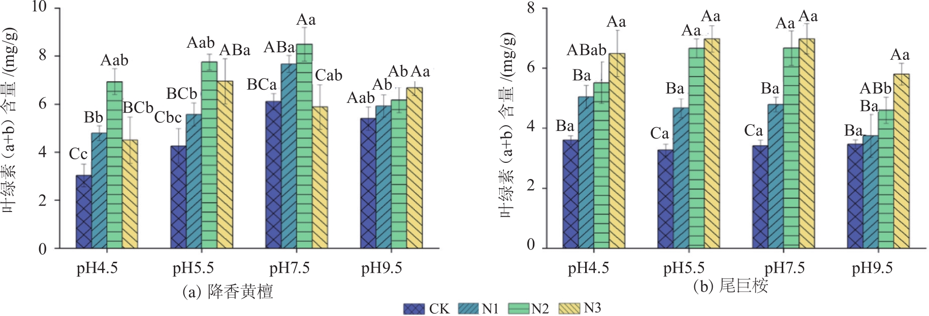 | pH9.5 | 降香黄檀 D.odorifera | CK | 993.33±40.60Cb | 333.03±45.54Cab | 1.32±0.02Ca | 0.46±0.03Bb |