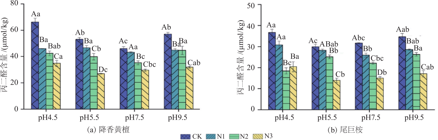 | pH7.5 | 降香黄檀 D.odorifera | CK | 1 260.67±26.35Da | 450.70±12.95Ca | 1.54±0.07Ca | 0.60±0.02Ba |