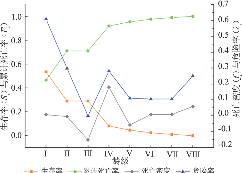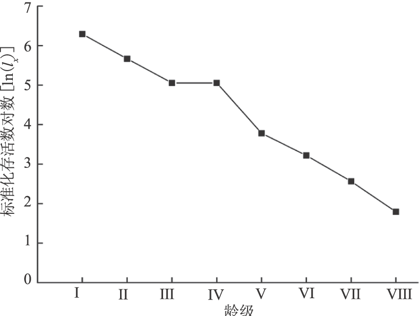 This study investigates the survival status and causes of endangerment of the wild population of the Heritiera parvifolia in Diaoluo Mountain,key protected wild plant of rational importance located within Hainan Tropical Rainforest National Park.The study analyzed and predicted population structure and dynamics using diameter class,the quantity dynamic index,static life table,survival curve,survival function,and time series prediction model.The results show that:1)The age class structure of Heritiera parvifolia population indicated an increasing trend.However,a 32.58% decline was observed from the age classes of Ⅱ to III,suggesting recruitment limitation.2)The quantity dynamic index(V7)was -0.666 7 between the VII and VIII age classes.This suggested a higher risk of decline among older individuals.Additionally,the non-interference dynamic index(Vpi),random interference dynamic index(V'pi) and random interference risk probability(Pmax)were all greater than zero,with Vpi significantly exceeding V'pi. This highlights the population’s sensitivity to external disturbances.3)The life expectancy(ex)peaked at age class III,and the survival curve resembled a Deevey-Ⅱ type.4)Survival functional analysis revealed a pattern of early-stage decline,significant fluctuations in the middle stage,and gradual decline in the later stages of the Heritiera parvifolia population.5)Projections for the next 2,4,6 and 8 age classes in the future indicate varying degrees of decline in individuals within age classes II and VIII.The primary factors contributing to the endangerment of Heritiera parvifolia include low seedling survival rates,intense intra and interspecific competition,heightened risk of decline among older individuals,and human disturbances.