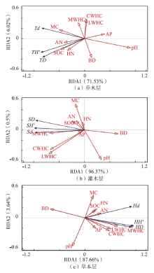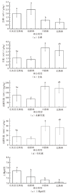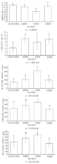 The investigation of the impact of Cupressus funebris forests of varying ages on soil physicochemical properties and plant diversity in limestone mountainous regions is of paramount importance for vegetation restoration in fragile ecosystems within rocky desertification zones.Focusing on Cupressus funebris forests in the limestone mountainous areas of Fuyang District,Hangzhou City,Zhejiang Province,China,this study categorized the forests into control(limestone non-stocked land),young forests,middle-aged forests,and near-mature forests.Employing the space-for-time substitution method,along with Pearson correlation analysis and Redundancy Analysis(RDA),the study explored the influence of Cupressus funebris forests of different ages on soil physicochemical properties and plant diversity in limestone mountainous regions.1)The soil bulk density of Cupressus funebris forests of all ages was lower than that of non-stocked land,whereas the maximum water-holding capacity,capillary water-holding capacity,minimum water-holding capacity,and moisture content of the soil,were higher.Among them,middle-aged forests had the lowest soil bulk density and the highest water-holding capacity,while young forests had the highest moisture content.2)The soil organic carbon,total nitrogen,and hydrolyzable nitrogen contents of Cupressus funebris forests of different ages were higher than those of non-stocked land,with middle-aged forests exhibiting the highest contents.3)The species richness of Cupressus funebris forests of all ages was higher than that of non-stocked land.Middle-aged forests exhibited the greatest species richness in both tree and herb layers,whereas young forests showed the greatest richness in the shrub layer.The Simpson dominance index of Cupressus funebris forests of all ages was higher than that of non-stocked land,and the Shannon-Wiener diversity index of young and middle-aged forests was significantly higher than that of non-stocked land.4)Correlation analysis and RDA indicated that pH was the primary factor influencing soil physicochemical properties and plant diversity in the region,followed by water-holding capacity,bulk density,moisture content,total phosphorus,and hydrolyzable nitrogen.In summary,the soil physicochemical properties and plant diversity of Cupressus funebris forests in limestone mountainous regions were significantly superior to those of non-stocked land,with middle-aged forests demonstrating the best overall performance.Cupressus funebris had a significant effect on improving soil in limestone mountainous regions,with effects varying by forest age.